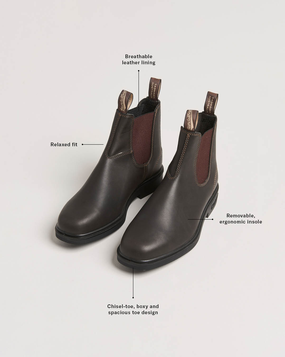 In der Classics-Serie finden wir unter anderem das Modell 587, eine aktualisierte Version des klassischen Modells 500. Das Modell 587 bewahrt Blundstones Erbe an Robustheit und Haltbarkeit, fügt jedoch eine elegante und zeitgemäße Ästhetik hinzu. Hergestellt aus Premiumleder mit rustikalem Finish unterscheidet sich dieses Modell von den Modellen 500 und 510 durch seine Oberflächenbehandlung, die einen entspannteren, aber dennoch raffinierten Look verleiht.