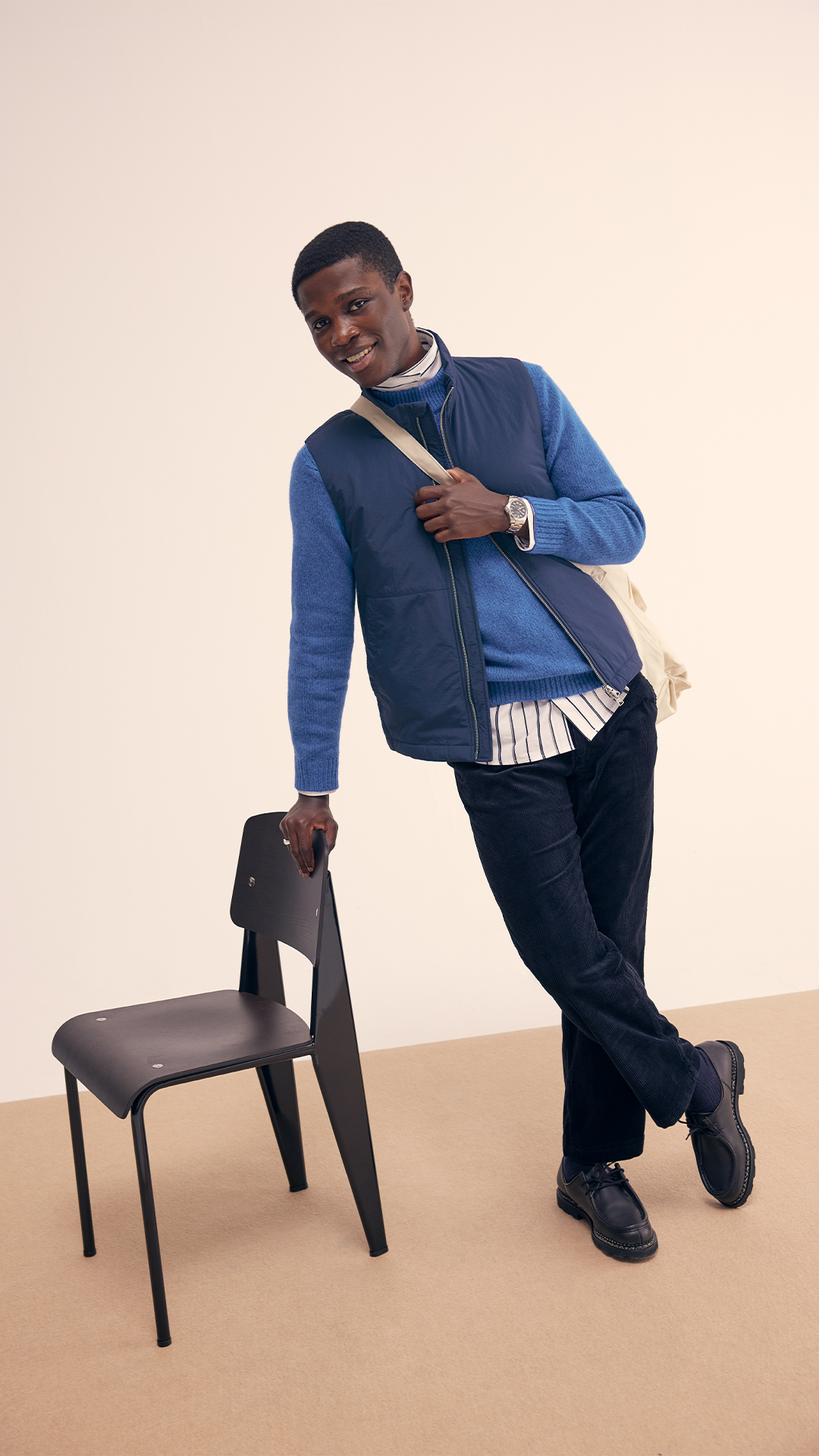 Mixing different shades of the same colour in one look can usually give a stylish impression. The blue vest from NN07 is a real spring favourite at Care of Carl, perfect as an extra layer under a coat. It’s insulated with Primaloft, an insulating synthetic fabric that keeps you both warm, has high breathability and resists moisture better than down. The light blue shirt underneath is a versatile model for those who don't like high neck turtleneck sweaters, but still want to add some warmth around the neck. Pair with a striped, straight fitting shirt to add a twist along with a pair of corduroy trousers. Finish the look by pairing a thicker rubber soled shoe. The model Michael from France’s Paraboot is a timeless derby that is timeless and very comfortable.