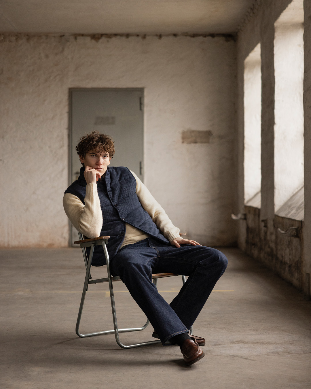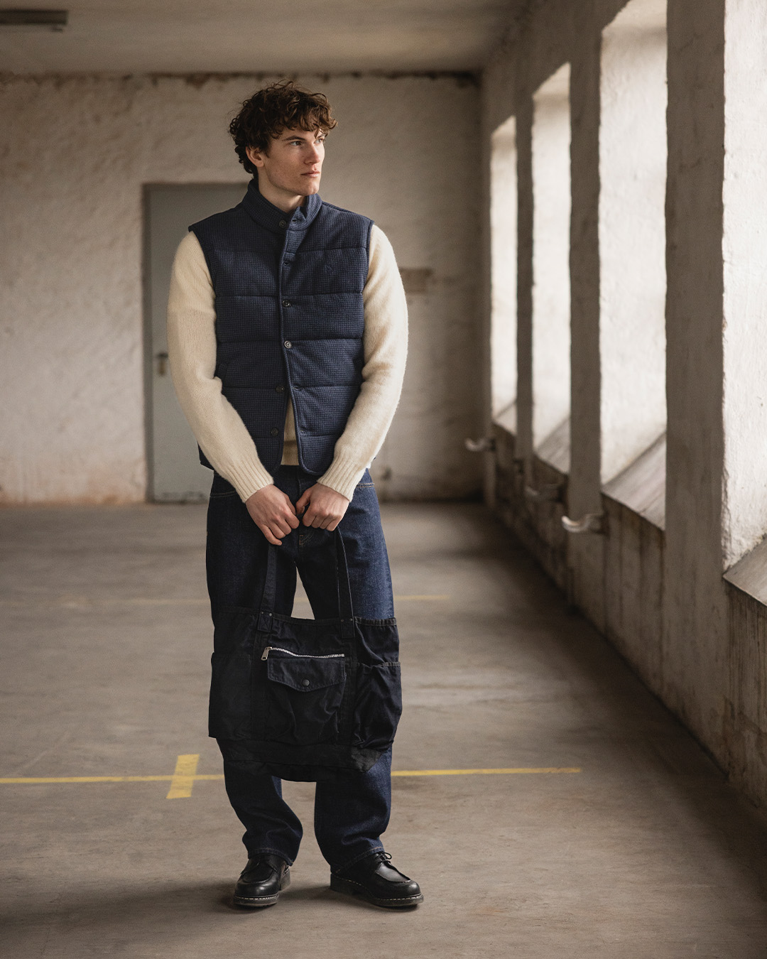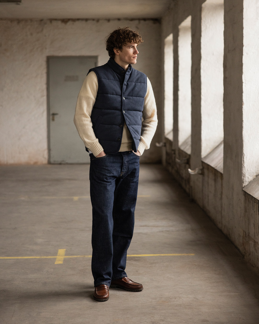 In this example, we start from the same base. Dark jeans, a light knitted sweater, and a navy quilted vest. The silhouette is relaxed yet considered. The color palette is safe: blue, denim, and warm off-white.