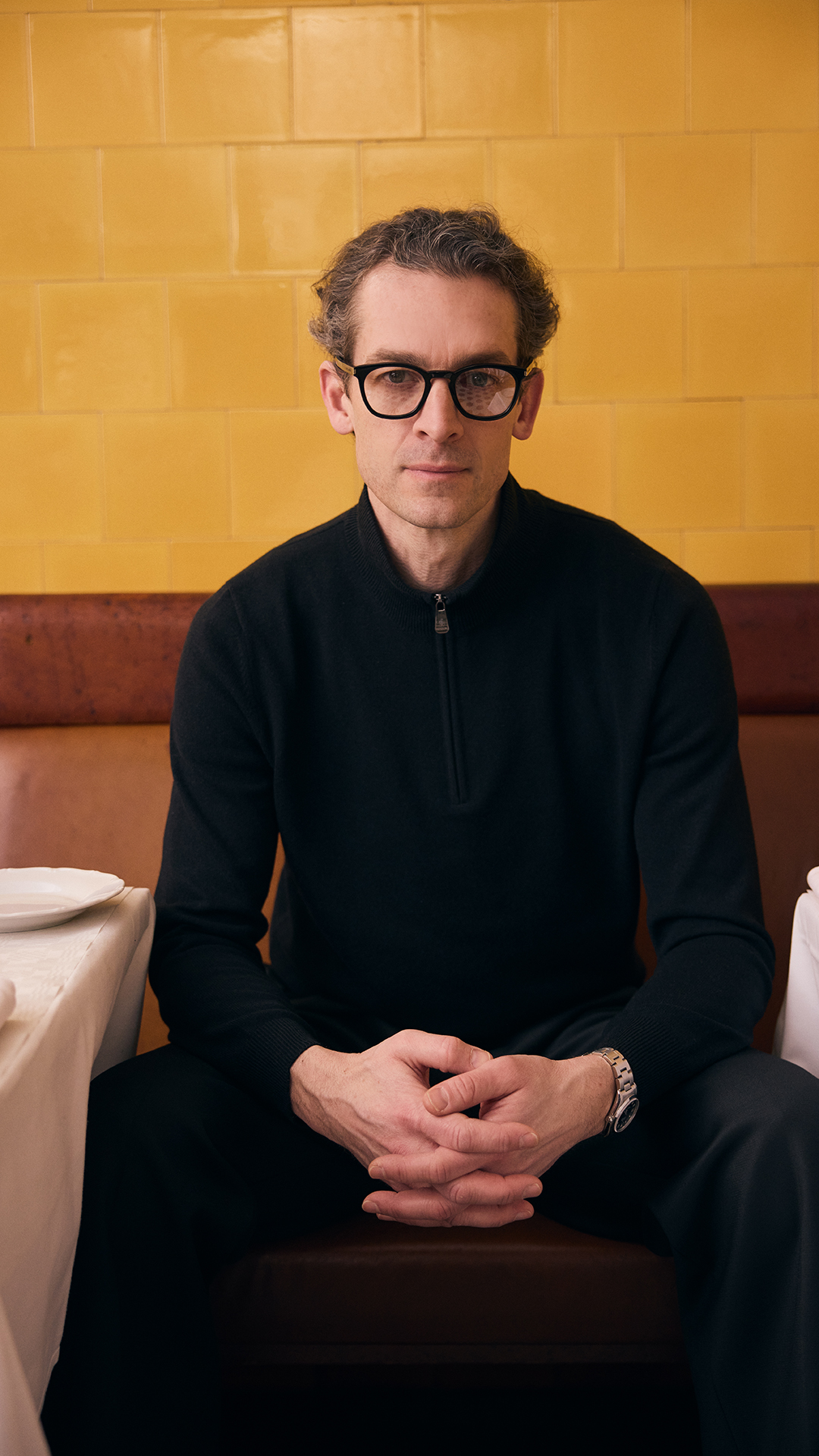 With the right garments, material and attitude, a all-black outfit can be an excellent choice when wanting to make a sophisticated impression. The black zip sweater from Italian Piacenza Cashmere is a versatile and functional garment. We choose to replace the shirt with a t-shirt and have the zip completely closed. This gives the experience of wearing a black polo shirt, but with an added detail in this form of the zip. A pair of dressy black trousers with a wider fit allow the proportions in this look to be even more interesting. Black loafers or derby’s in black leather, preferably with a bit of shine, keep the degree of formality high. Don't forget the watch or the black glasses/sunglasses to add the final element.