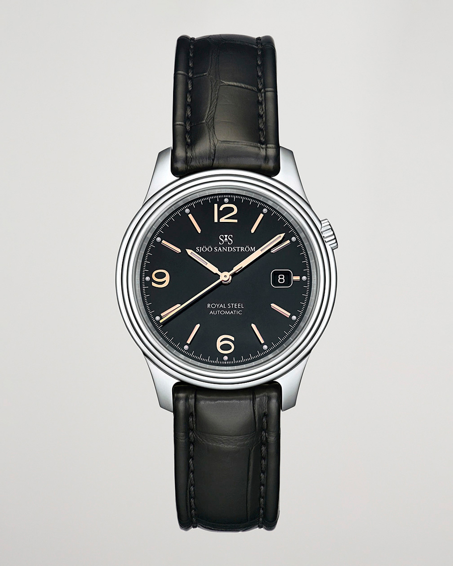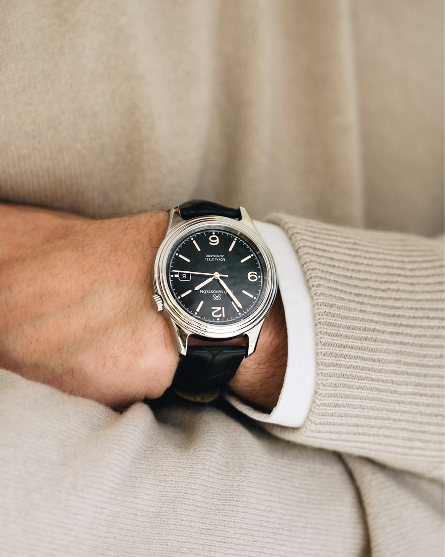 • Mechanische Armbanduhr aus rostfreiem Edelstahl mit einem Armband aus Kalbsleder von Sjöö Sandström.